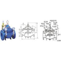 当阀门从进水端给水时,流水过针阀进入主阀门控制室,并通过针阀开度从主阀门控制室流出,球阀流向出口,并且主阀门座落一个全然开启或浮动状况调节主阀上部的流量控制阀以为主阀设立一定的开度调节导阀并调节先导阀的弹簧压力以将主阀保持在开度设定开度,当压力变化时,先导阀将自动调节以保持流量恒定。
